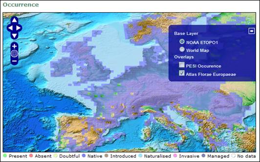 Atlas Florae Europaeae (AFE) provides its occurrence data via a Web Mapping Service (WMS) server set up at the University of Helsinki. They have been extracted from the AFE volumes (http://www.luomus.fi/english/botany/afe/index.htm) and displayed as a grid colored by the PESI Occurrence Statuses. These occurrences are restricted to a number of vascular plants described in AFE.